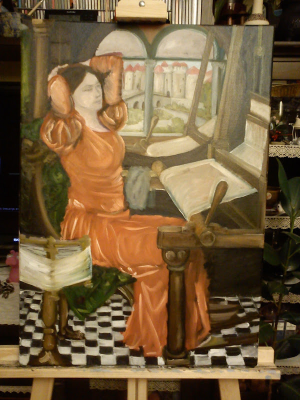 Hay que corregir la perspectiva del espejo en el telar y creo que todo el cuadro está torcido porque mi soporte no sujeta bien. Habrá que forrarlo con algo.